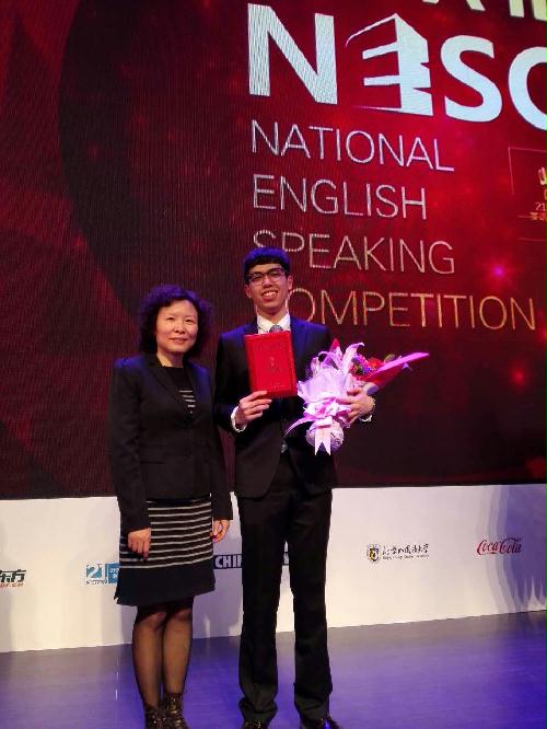 在3月18日的全国半决赛中,主题是Two Cheers for “Made in China”?唐杰同学以饶有趣味的演讲内容、激情又不失稳重的即兴演说和敏捷从容的问答获得了评委的一致好评,从全国34名地区赛佼佼者中脱颖而出,以小组第二的优异成绩顺利晋级全国总决赛。
